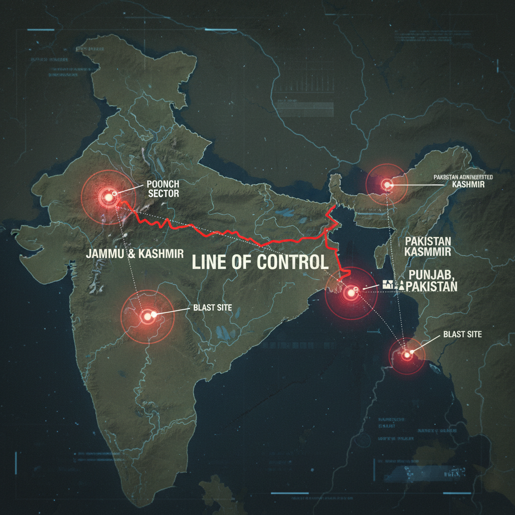 सूत्रों के अनुसार, पहला विस्फोट जम्मू-कश्मीर के पुंछ सेक्टर के पास एक दूरदराज के इलाके में हुआ। आतंकवादियों ने एक भारतीय सैन्य काफिले को निशाना बनाते हुए एक शक्तिशाली इम्प्रोवाइज्ड एक्सप्लोसिव डिवाइस (IED) में विस्फोट किया। यह हमला उस समय हुआ जब काफिला एक संकरे पहाड़ी रास्ते से गुजर रहा था।