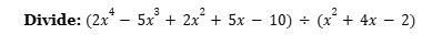 - चरण 1: 2x⁴ को x² से विभाजित करें, परिणाम 2x² है। अब 2x² से पूरे भाजक (x² + 4x – 2) को गुणा करें और भाज्य से घटाएं।