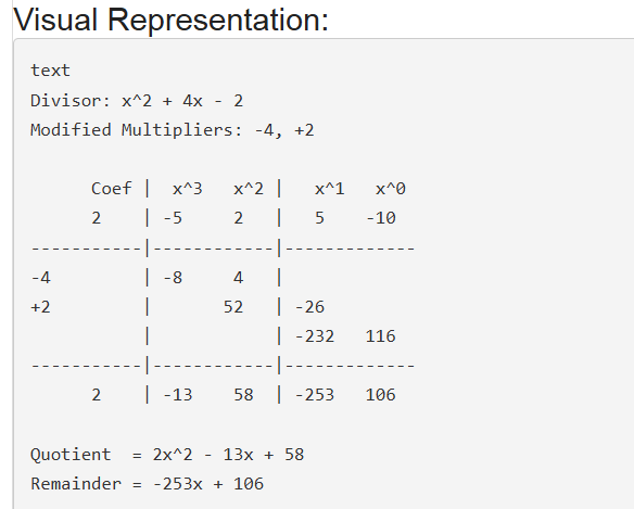 - चरण 6: अंतिम शेषफल -253x + 106 बचता है। यह प्रक्रिया लंबी और समय लेने वाली है।