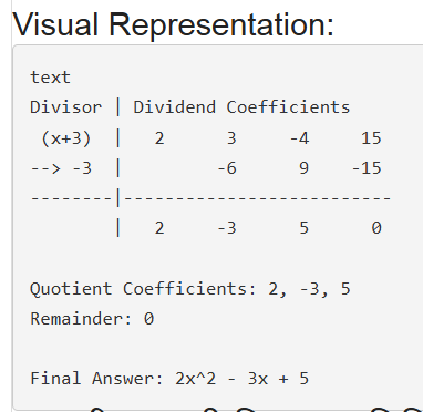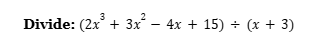 - चरण 1: भाज्य (Dividend) के गुणांक लिखिए: 2, 3, -4, 15।