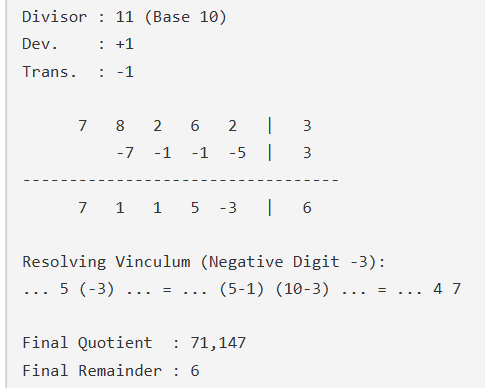 • ६. अतः भागफलम् ७१,१४७ तथा च शेषः ६ प्राप्तः। अयं विधिः वैदिकविधेः अपेक्षया अधिकं समयं गणनकार्यं च अपेक्षते।